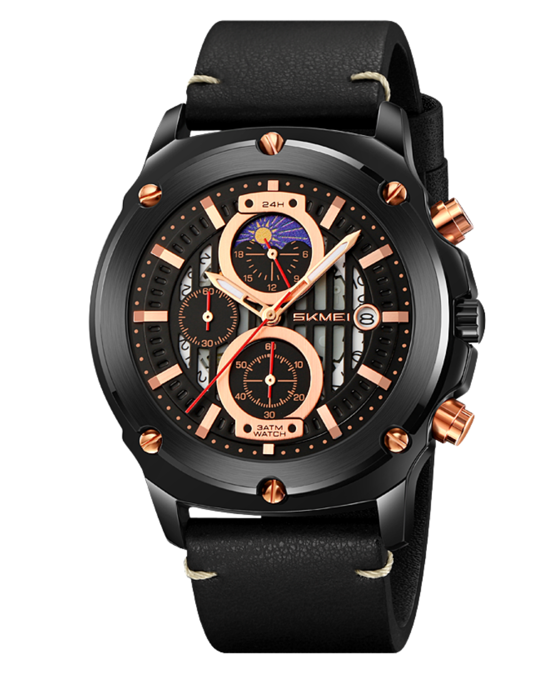 El reloj SKMEI 9351 ofrece hora analógica y fecha, junto con un cronómetro integrado para mayor funcionalidad. También cuenta con indicación de día y noche, y está diseñado para resistir salpicaduras y lluvias, aunque no es sumergible. Este modelo incluye una garantía de 1 año, asegurando calidad y confianza en su uso diario.